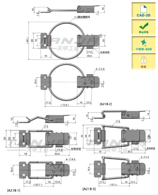搭扣獨(dú)特的自鎖機(jī)構(gòu)設(shè)計,防止搭扣在使用過程中彈開,使用方便安全
