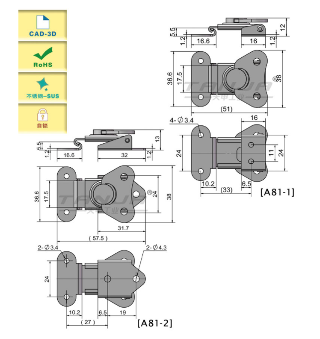 在食品機(jī)械領(lǐng)域,例如,食品加工、餐飲、釀造機(jī)械加工設(shè)備中等,設(shè)備的使用過程中會(huì)有酸堿,化學(xué)物質(zhì),液體的濺入,不銹鋼搭扣的防腐蝕能力,及光亮的外觀,應(yīng)用廣泛。