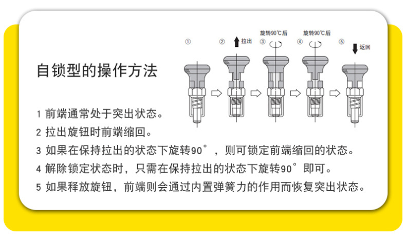 自鎖型旋鈕柱塞的前端一般是凸出的,想要前端縮回,拉出旋鈕并旋轉(zhuǎn)90度,就可以鎖住了,想要解除鎖定,在拉出情況下旋轉(zhuǎn)90度就好了,如果放開旋鈕,前端就會(huì)通過內(nèi)置彈簧力的作用恢復(fù)。