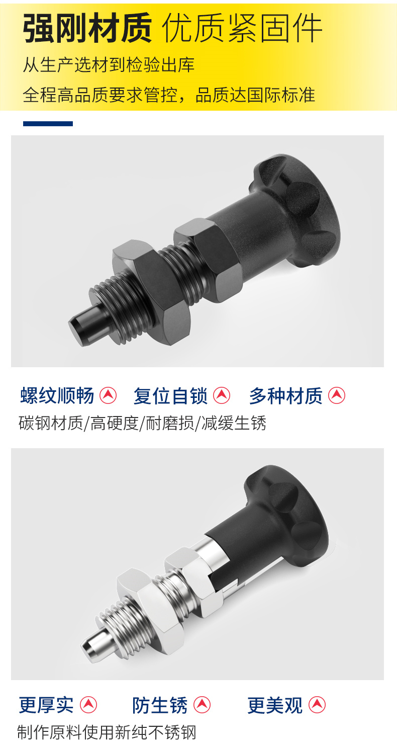 2、旋鈕柱塞安裝靈活:適用于有定位需求的線性運(yùn)動(dòng)和旋轉(zhuǎn)運(yùn)動(dòng)機(jī)構(gòu),通用螺紋安裝即可,拆裝方便