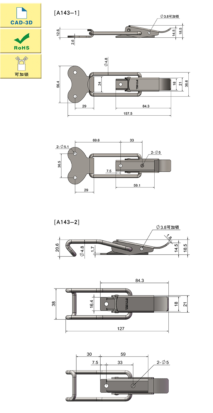 A143-2:弧形彈簧鋼線使搭扣具有彈性預壓力,并具有減振功能