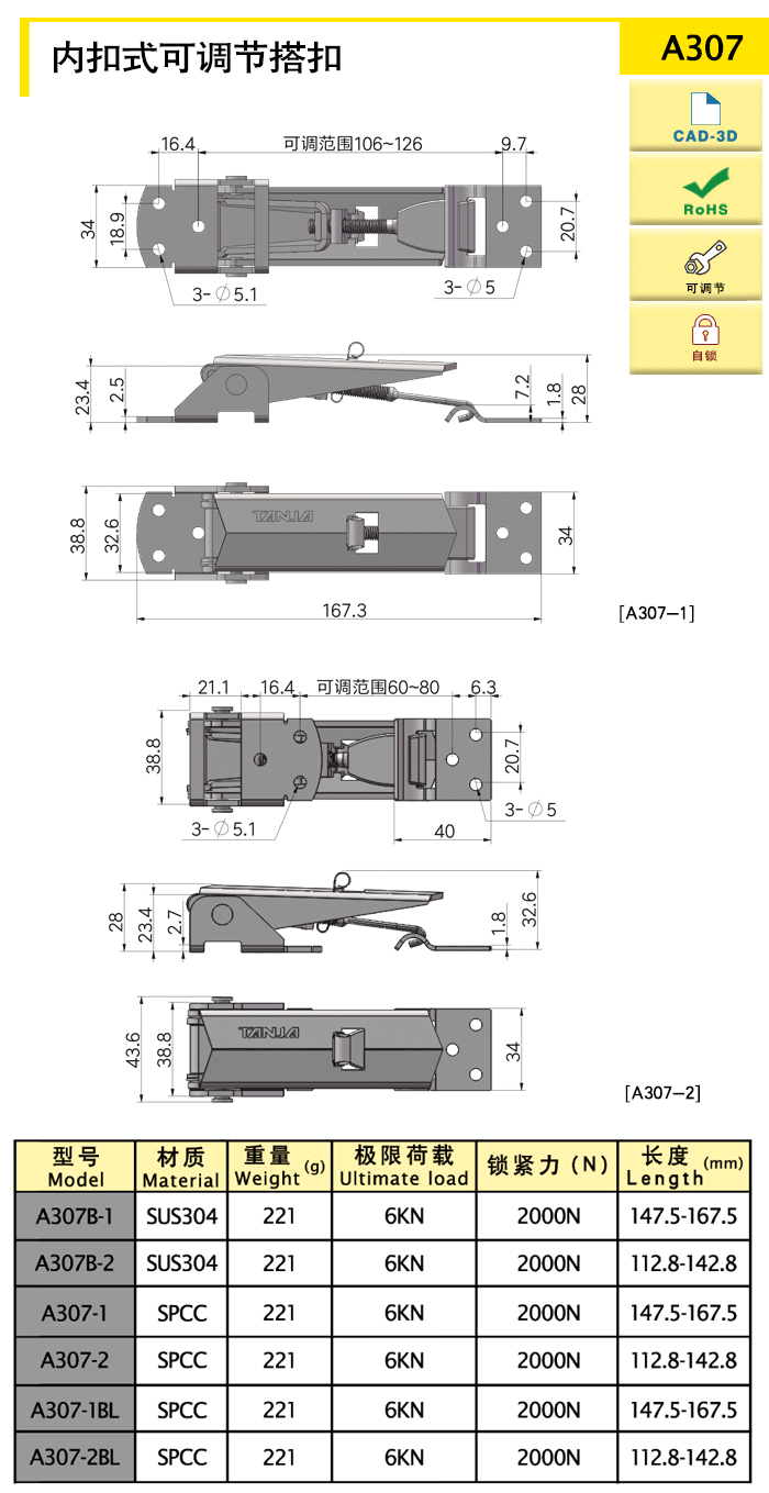 | A307-2BL | 112.8-142.8 | SPCC | 210.04 | 2000 | 6000 | 內(nèi)扣式,可調(diào)節(jié),自鎖 | 下載 |