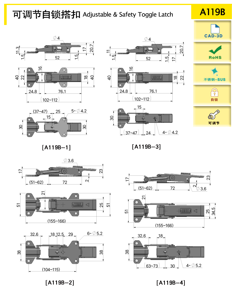 A119B-4 | 155-166 | SUS304 | 172.21 | 800 | 2000 | 可調(diào)節(jié),自鎖 | 下載 |