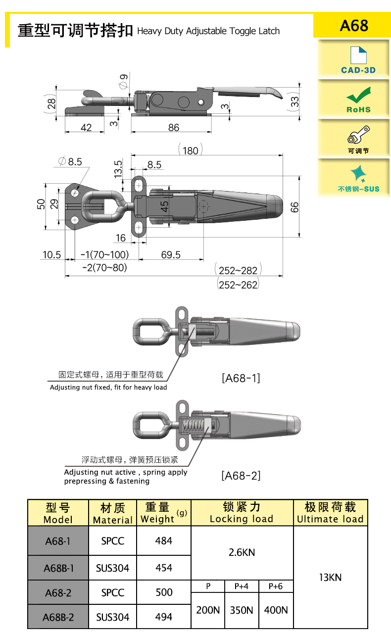 | A68-2 | 300 | SPCC | 500 | 200/350/400 | 13000 | 可調(diào)節(jié),帶鎖 | 下載 | ||||