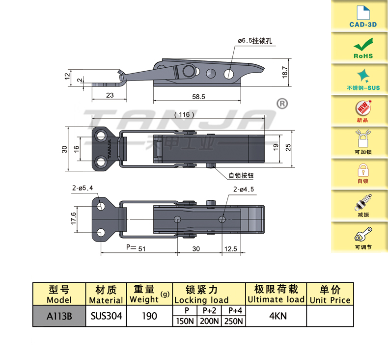 獨特的安全銷可以實現(xiàn)自鎖功能,具有可靠的安全性,搭扣不會因振動松脫