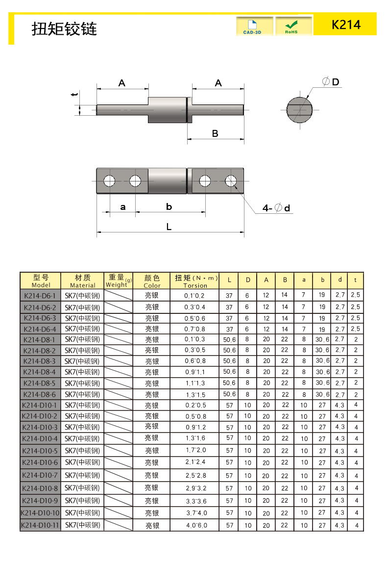 | K214-D6-4 | 碳鋼 | 37 | 銀白 | 100 | 固定扭矩 | 下載 | ||||