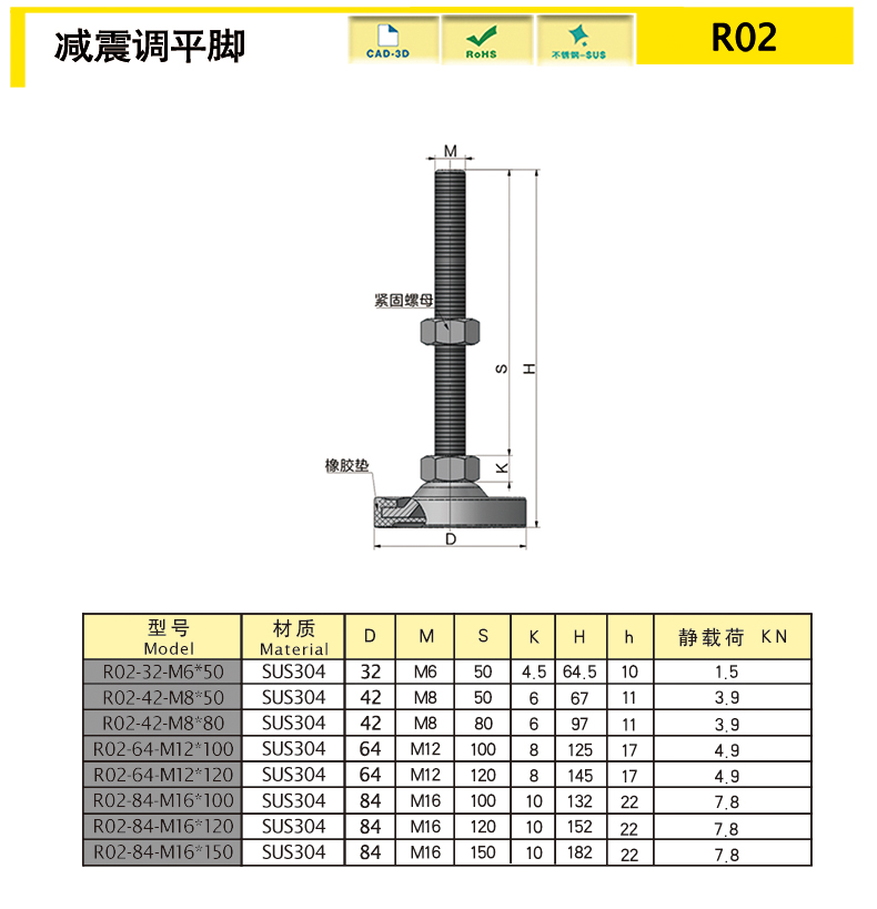 | 型號 | 材質(zhì) | 直徑D | M | S | K | H | h | 重量(g) | 靜載荷(KN) | 3D圖紙 | 選購 | |||