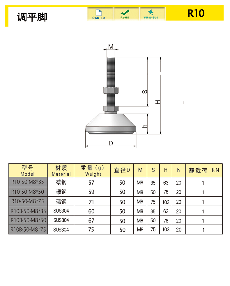 | R10B-50-M8-50 | SUS304 | 50 | M8 | 75 | 78 | 20 | 1 | 1 | 下載 | ||||