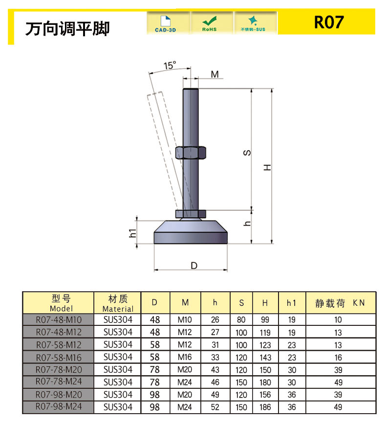 | 型號 | 材質(zhì) | 直徑D | M | S | H | h | h1 | 重量(g) | 靜載荷(KN) | 3D圖紙 | 選購 | |||